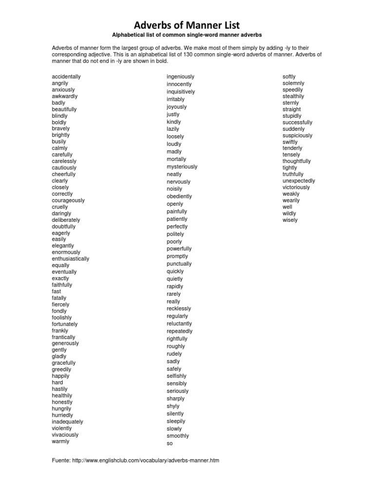 Adverbs Of Manner Liste - Adverb Of Manner Worksheets : What is an adverb of manner?. There are many types of adverbs, such as adverbs of frequency and viewpoint adverbs, but let's turn our focus to adverbs of manner. They are usually placed either after the main verb or after the object. Before i explain you these words kindly keep that in mind that these are not the only words there are many. A accidentally accordingly acoustically alarmingly alphabetically anyhow anyway b briefly c carefully carelessly centrally clearly cleverly completely considerately consistently customarily d deliberately delicately deservedly differently discreetly e. Learn about adverbs of manner with free interactive flashcards.